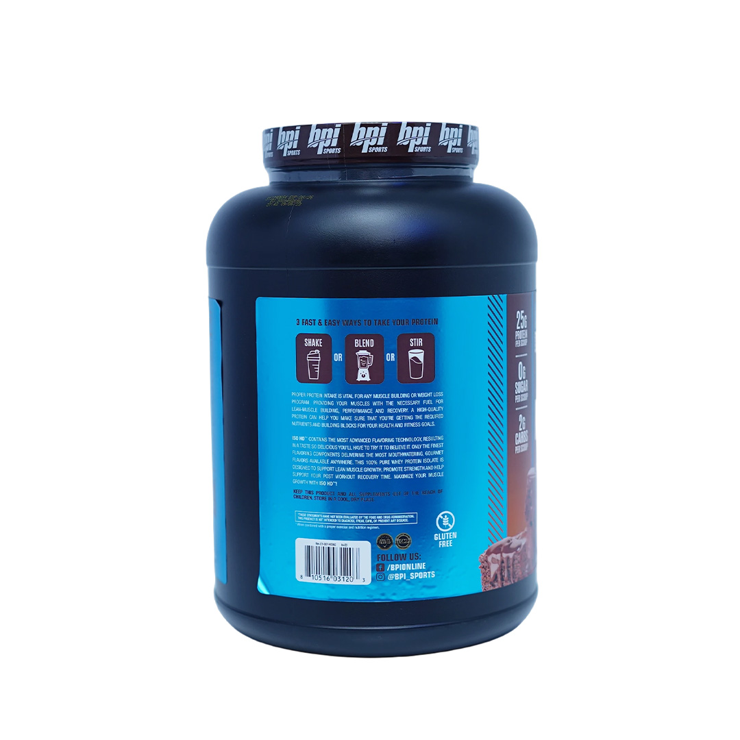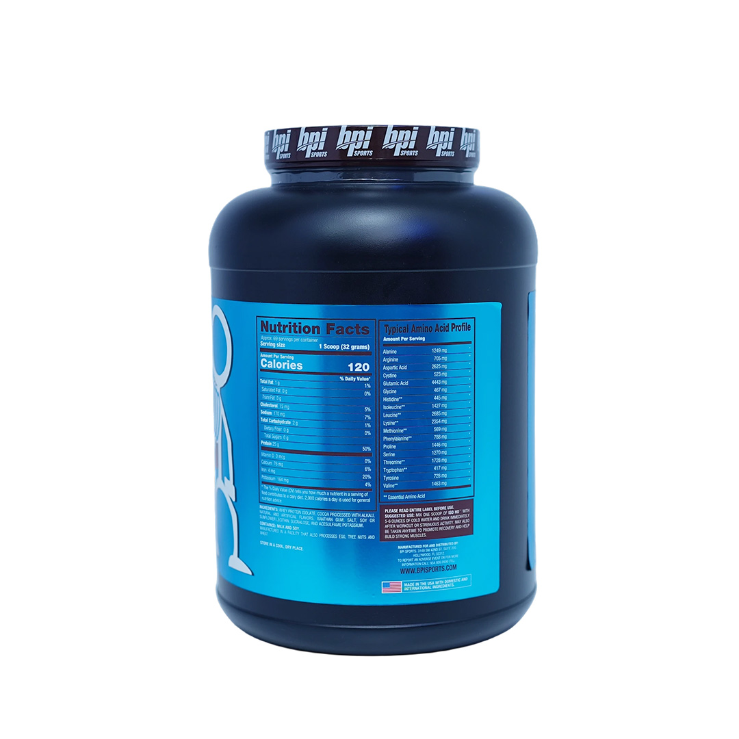 BPI Sports ISO HD™ is a dietary supplement featuring 100% pure isolate protein powder. This product comes in a Chocolate Brownie flavor (natural and artificial flavors) and is made in the USA. The large container provides approximately 69 servings and has a net weight of 4.9 lbs (2,208 grams).