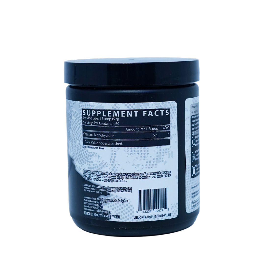 Nutrex Research Creatine Monohydrate is a dietary supplement presented as a pure and micronized powder designed to support strength and performance. This unflavored formula offers versatility in how it can be consumed. Each container provides 60 servings and has a net weight of 300g (10.58 oz). The product carries the brand’s tagline “Be Unstoppable.”