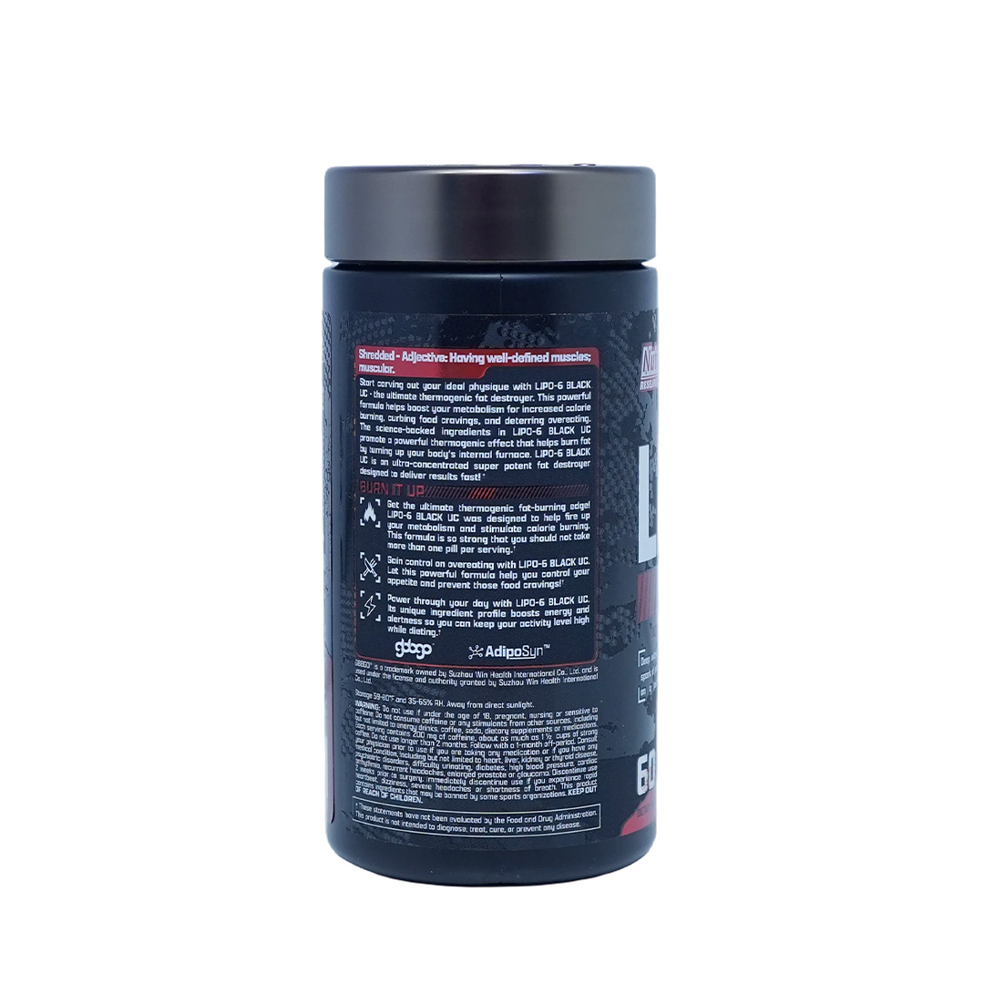 Nutrex Research Lipo 6 Black Ultra Concentrate is a dietary supplement presented as an “Ultimate Thermogenic Fat Destroyer!”. It comes in a fast-acting liqui-cap form, designed for rapid absorption. Each bottle contains 60 liqui-caps and carries the tagline “Be Unstoppable.”
