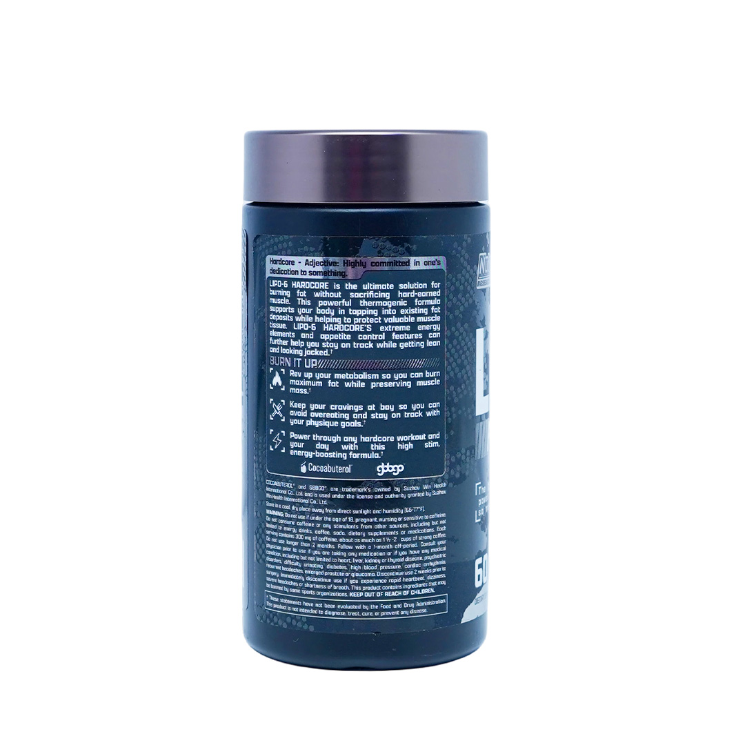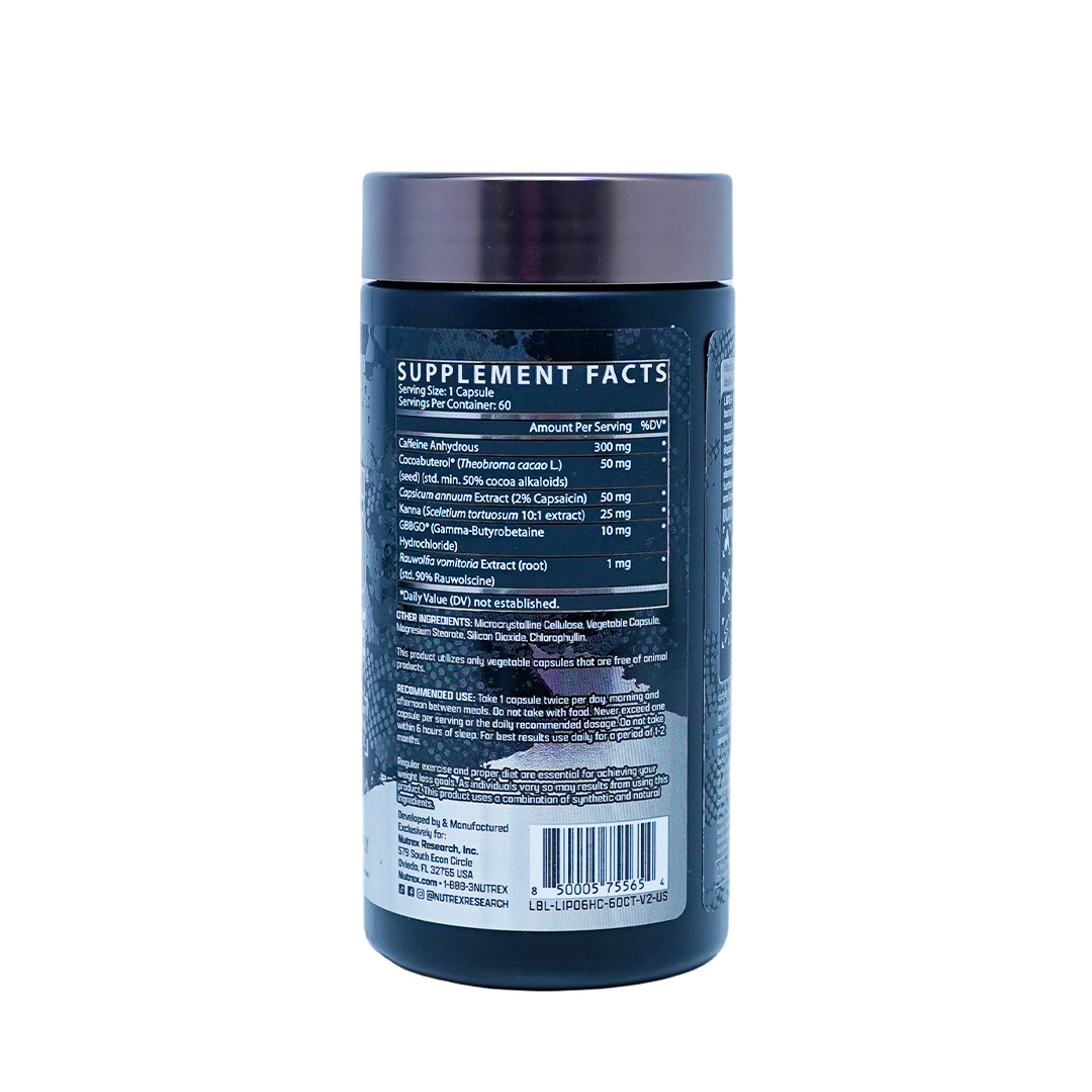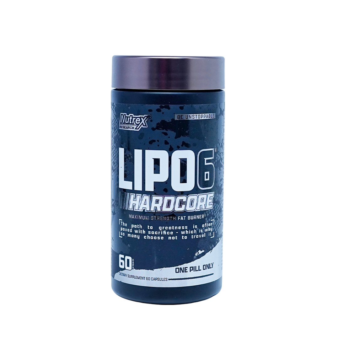 Nutrex Research Lipo 6 Hardcore is a dietary supplement marketed as a maximum strength fat burner. Packaged in a container of 60 capsules, it emphasizes a potent formula with a “One Pill Only” serving suggestion. The product carries the tagline “Be Unstoppable.”
