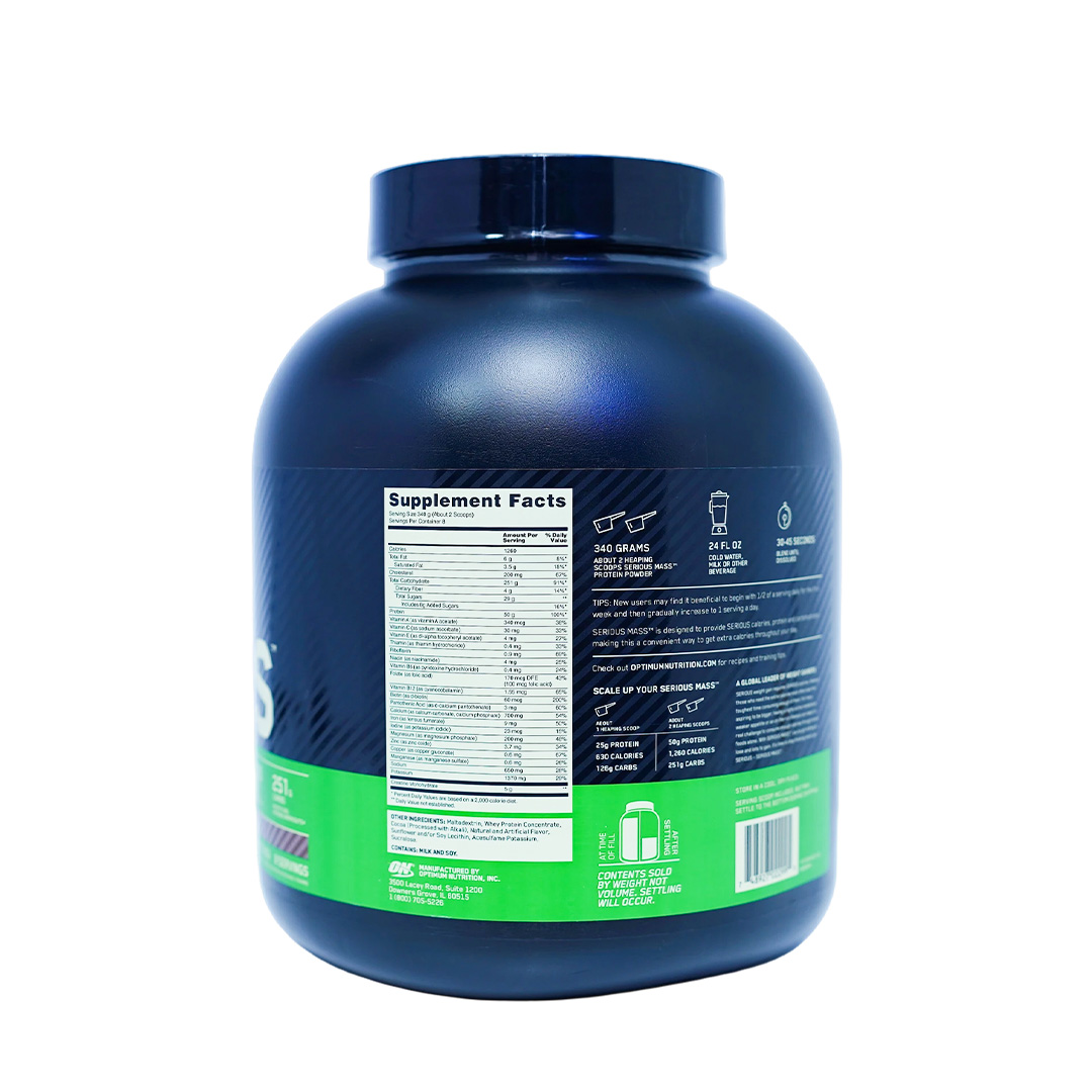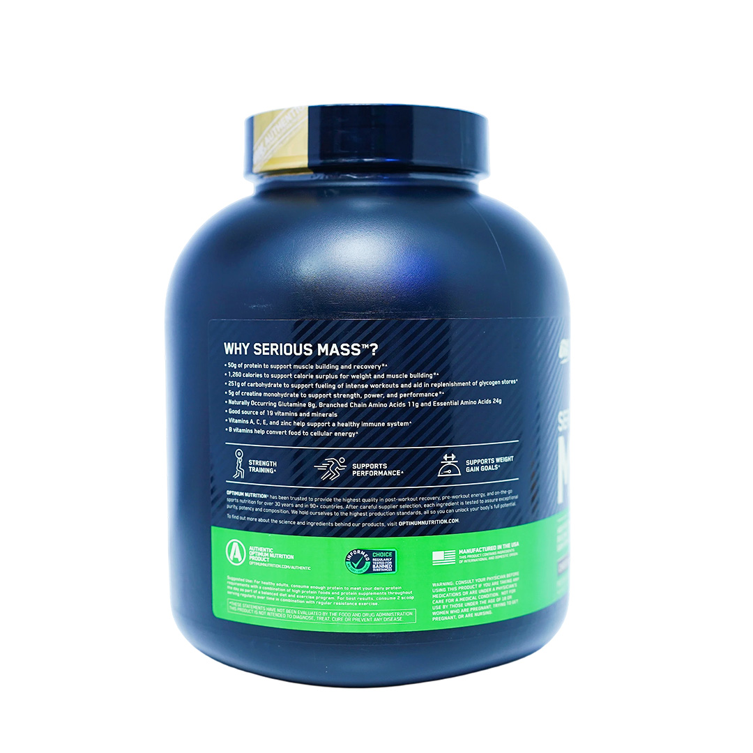 Pack on the pounds and build the physique you’ve always wanted with Optimum Nutrition Serious Mass. Specifically formulated for the hardgainer and athletes striving to break through strength and size plateaus, Serious Mass delivers the calories, protein, and carbohydrates needed to fuel serious gains. Each potent serving is packed with a massive 1,260 calories, 50 grams of high-quality blended protein for muscle building and repair, and over 250 grams of carbohydrates to provide sustained energy and help replenish muscle glycogen stores after intense workouts.
